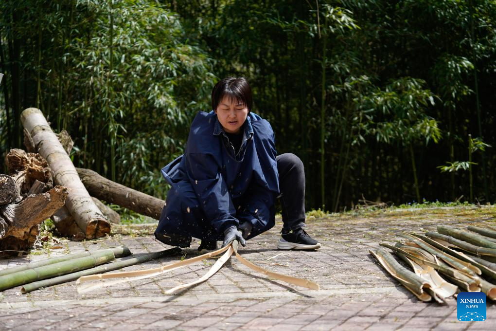 La cuidadora de pandas gigantes, Li Rong, procesa bambú antes de alimentar a los pandas en la base de pandas gigantes de Shenshuping de la Reserva Natural Nacional de Wolong, en la provincia suroccidental china de Sichuan, el 27 de marzo de 2025. (Xinhua/Xu Bingjie.)