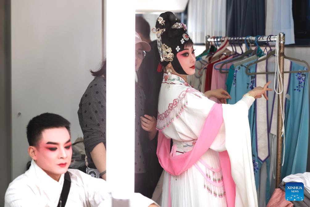 Artistas se preparan antes de la representación de la ópera tradicional china Wu «La leyenda de la serpiente blanca» en Viena, Austria, el 5 de abril de 2025. (Xinhua/Zhao Dingzhe.)