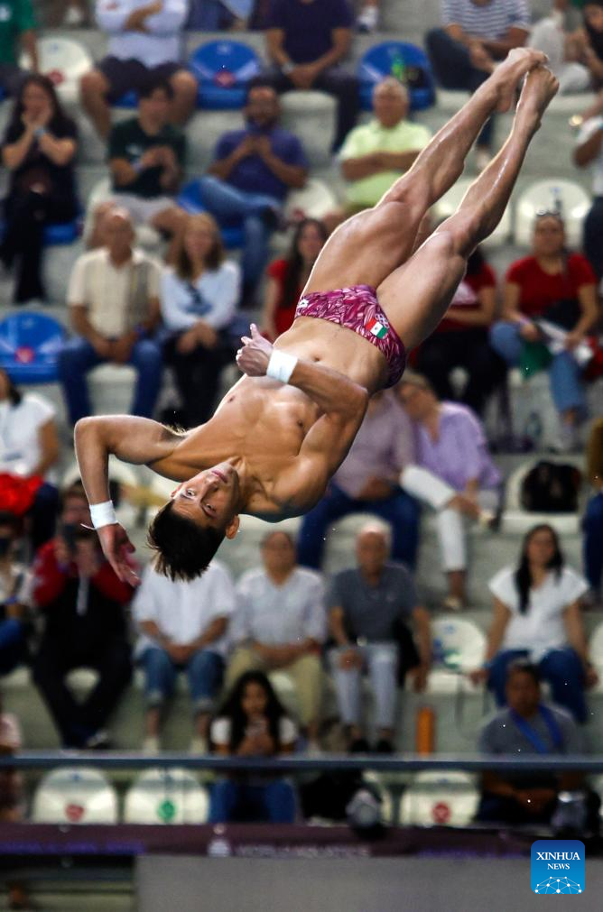 Imagen del 6 de abril de 2025 de Randal Willars Valdez, de México, compitiendo durante la final de plataforma de 10 metros masculinos en la Copa Mundial de Clavados, en Guadalajara, estado de Jalisco, México. (Xinhua/Diana Márquez)
