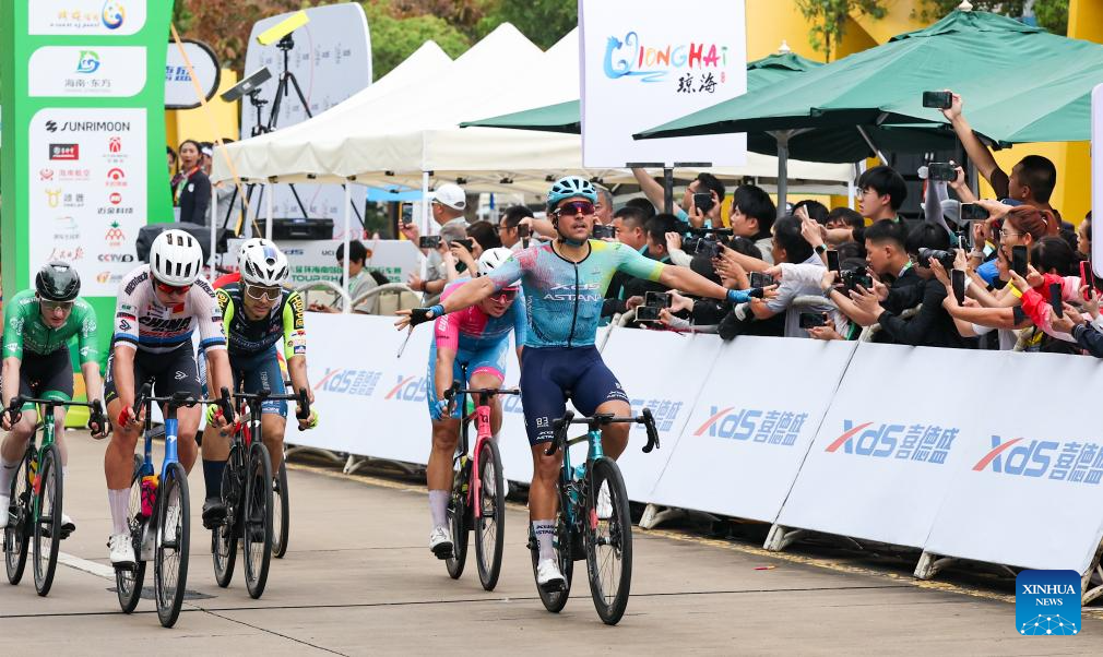Matteo Malucelli (delante) del equipo XDS Astana celebra su actuación después de cruzar la línea de meta durante la 1.ª etapa en la 16.ª Vuelta de la carrera ciclista de Hainan en Qionghai, provincia de Hainan en el sur de China, el 7 de abril de 2025. (Xinhua/Yang Guanyu.)
