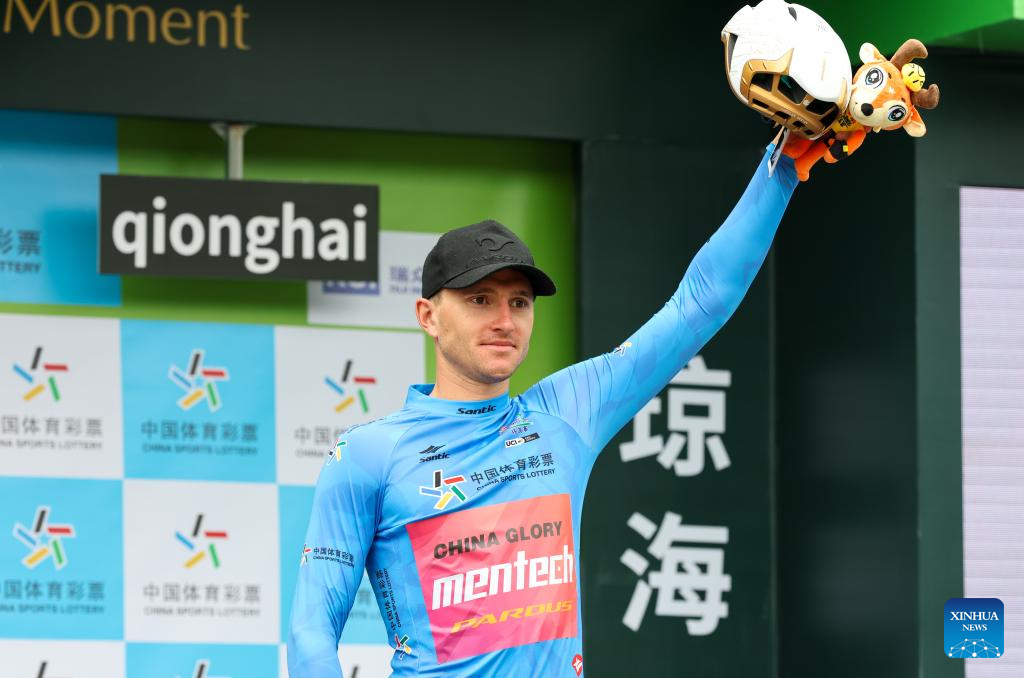 Yevgeniy Gidich, del equipo ciclista continental Glory-MENTECH de China, celebra su logro con el maillot azul durante la ceremonia de entrega de premios de la primera etapa de la 16.ª Vuelta Ciclista a Hainan, en Qionghai, provincia de Hainan, en el sur de China, el 7 de abril de 2025. (Xinhua/Yang Guanyu)