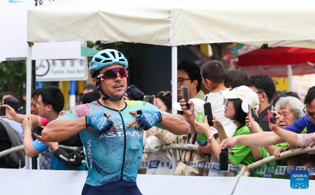 Matteo Malucelli, del equipo XDS Astana, celebra su actuación después de cruzar la línea de meta durante la 1.ª etapa de la 16.ª Vuelta Ciclista a Hainan, en Qionghai, provincia de Hainan, en el sur de China, el 7 de abril de 2025. (Xinhua/Yang Guanyu.)