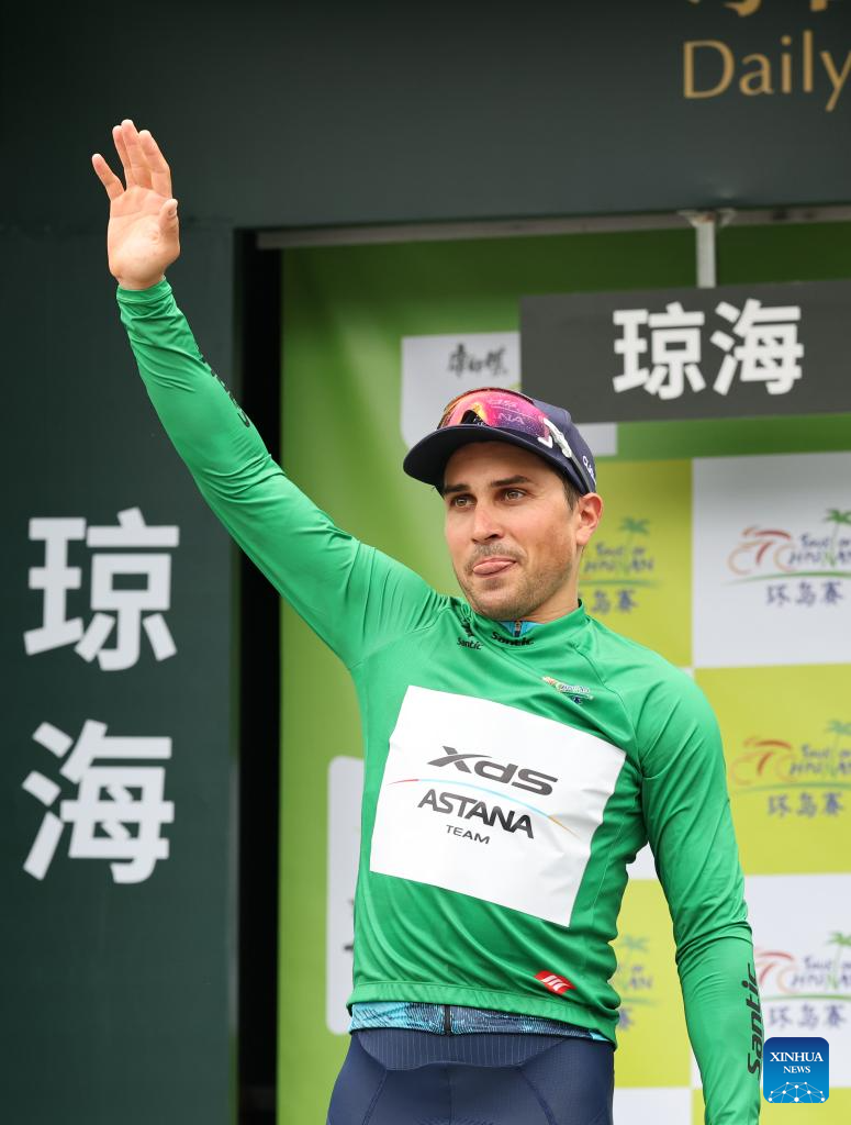Matteo Malucelli, del equipo XDS Astana, celebra su logro con el maillot verde durante la ceremonia de entrega de premios de la 1.ª etapa de la 16.ª Vuelta Ciclista a Hainan, en Qionghai, provincia de Hainan, en el sur de China, el 7 de abril de 2025. (Xinhua/Yang Guanyu.)
