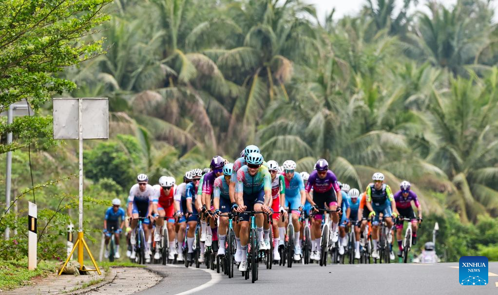 Ciclistas compiten durante la 1.ª etapa de la 16.ª Vuelta Ciclista a Hainan, en Qionghai, provincia meridional china de Hainan, el 7 de abril de 2025. (Xinhua/Yang Guanyu.)