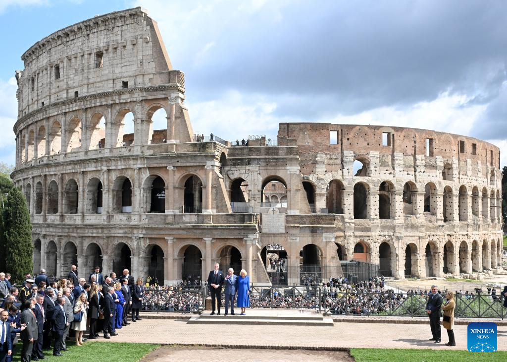 El rey Carlos III de Gran Bretaña y la reina Camila frente al Coliseo durante una ceremonia de bienvenida en Roma, Italia, el 8 de abril de 2025. (Fotografía de Alberto Lingria/Xinhua.)