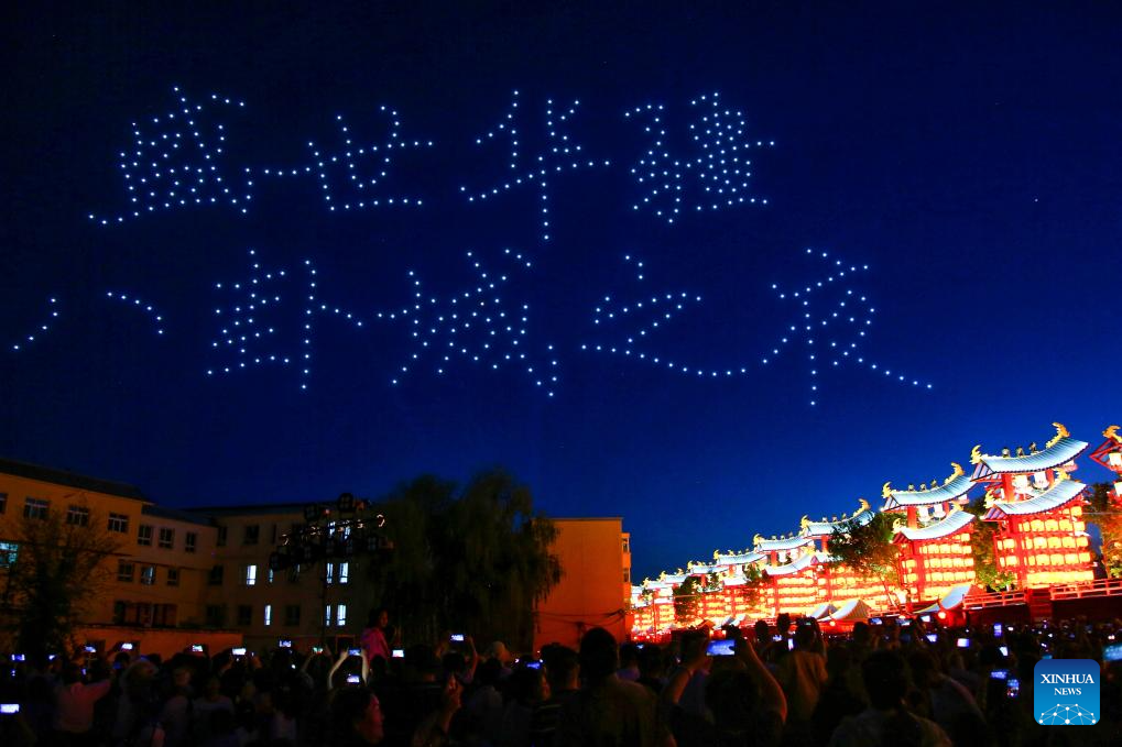Un grupo de personas observa una actuación de drones en el distrito de Tekes, en la prefectura autónoma de la etnia kazaka de Ili, región autónoma uygur de Xinjiang, en el noroeste de China, el 9 de junio de 2023. (Fotografía de Zhao Fengshou/Xinhua.)