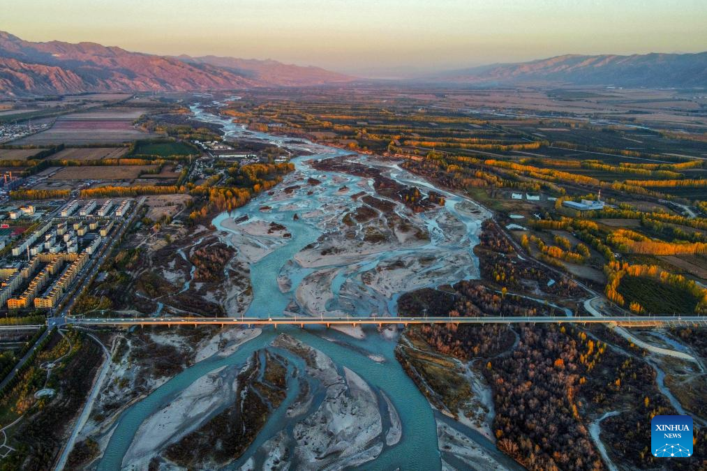 Una foto aérea tomada el 9 de octubre de 2024 muestra una vista del río Tekes en el distrito de Tekes, prefectura autónoma de la etnia kazaja de Ili, región autónoma uygur de Xinjiang, noroeste de China. (Fotografía de Zhao Fengshou/Xinhua.)