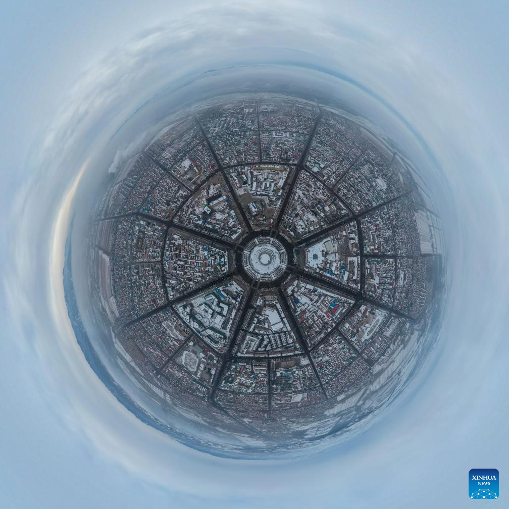 Una foto aérea panorámica tomada el 2 de enero de 2021 muestra una vista del distrito de Tekes en la prefectura autónoma de la etnia kazaja de Ili, región autónoma uygur de Xinjiang, en el noroeste de China. (Xinhua/Ding Lei.)