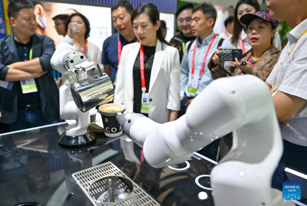 Visitantes observan un robot preparando café, en la V Exposición Internacional de Productos de Consumo de China (CICPE, por sus siglas en inglés), en Haikou, en la provincia de Hainan, en el sur de China, el 13 de abril de 2025. La V CICPE durará del 13 al 18 de abril en la provincia insular de Hainan, en el sur de China. Como la única exposición a nivel nacional de China centrada en bienes de consumo, la edición de este año pone énfasis en la innovación y la colaboración global. La exposición ha atraído la participación de más de 4.100 marcas de más de 70 países y regiones. (Xinhua/Guo Cheng)