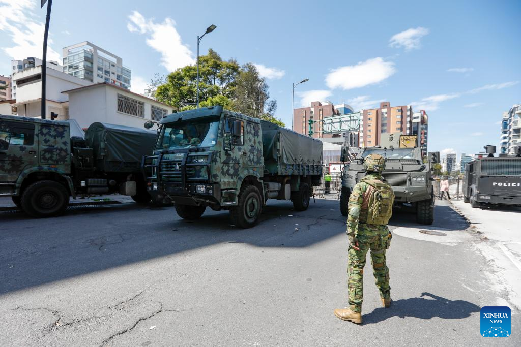 Un soldado vigila frente al Consejo Nacional Electoral (CNE), en la ciudad de Quito, capital de Ecuador, el 14 de abril de 2025. El presidente de Ecuador, Daniel Noboa, fue reelegido en la segunda vuelta de las elecciones celebradas el domingo para un nuevo mandato de cuatro años, con el 92,64 por ciento de las actas escrutadas, según los primeros resultados oficiales difundidos por el CNE. (Xinhua/Ricardo Landeta)