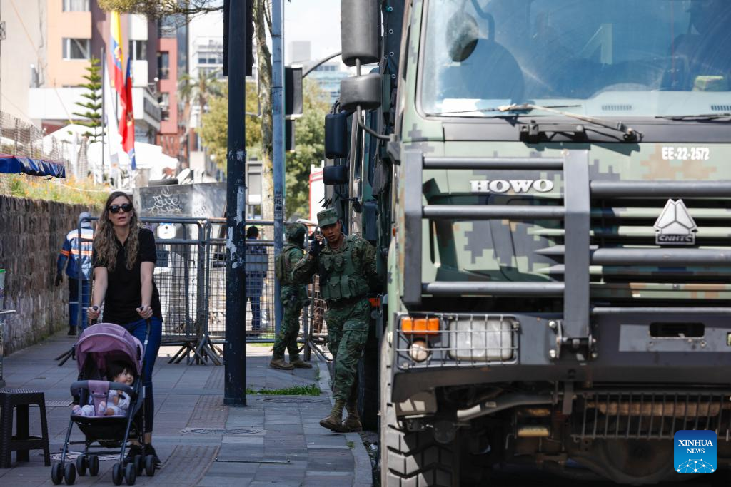 Una mujer empuja una carriola mientras camina junto a un militar frente al Consejo Nacional Electoral (CNE), en la ciudad de Quito, capital de Ecuador, el 14 de abril de 2025. El presidente de Ecuador, Daniel Noboa, fue reelegido en la segunda vuelta de las elecciones celebradas el domingo para un nuevo mandato de cuatro años, con el 92,64 por ciento de las actas escrutadas, según los primeros resultados oficiales difundidos por el CNE. (Xinhua/Ricardo Landeta)