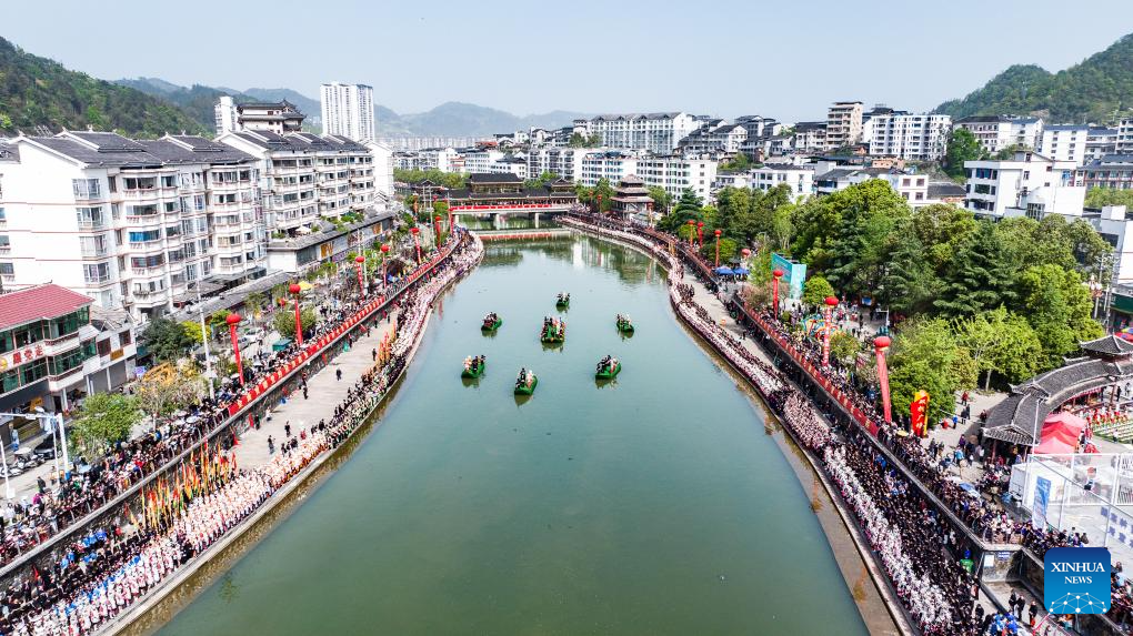 Vista aérea tomada con un dron el 13 de abril de 2025 de personas en trajes étnicos asistiendo a un evento de canto para celebrar el Festival de las Hermanas Miao, en el distrito de Taijiang, en la provincia de Guizhou, en el suroeste de China. El evento de canto se llevó a cabo aquí junto a un río el domingo, como parte de las celebraciones del Festival de las Hermanas Miao, un patrimonio cultural nacional inmaterial. (Xinhua/Tao Liang)
