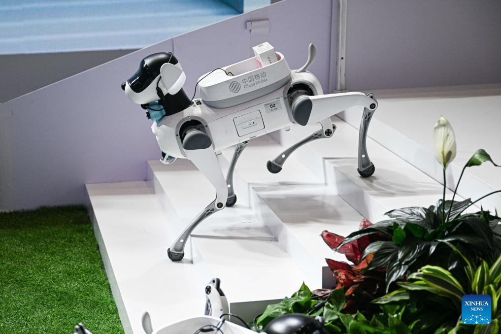 Un perro robot carga medicinas en la V Exposición Internacional de Productos de Consumo de China (CICPE, por sus siglas en inglés), en Haikou, en la provincia de Hainan, en el sur de China, el 14 de abril de 2025. La exposición de este año destaca la tecnología futurista a través del debut de diversos robots innovadores. Al presentar funcionalidades impulsadas por Inteligencia Artificial y aplicaciones de mundo real, estos robots ofrecen un vistazo al futuro de la vida cotidiana. (Xinhua/Pu Xiaoxu)