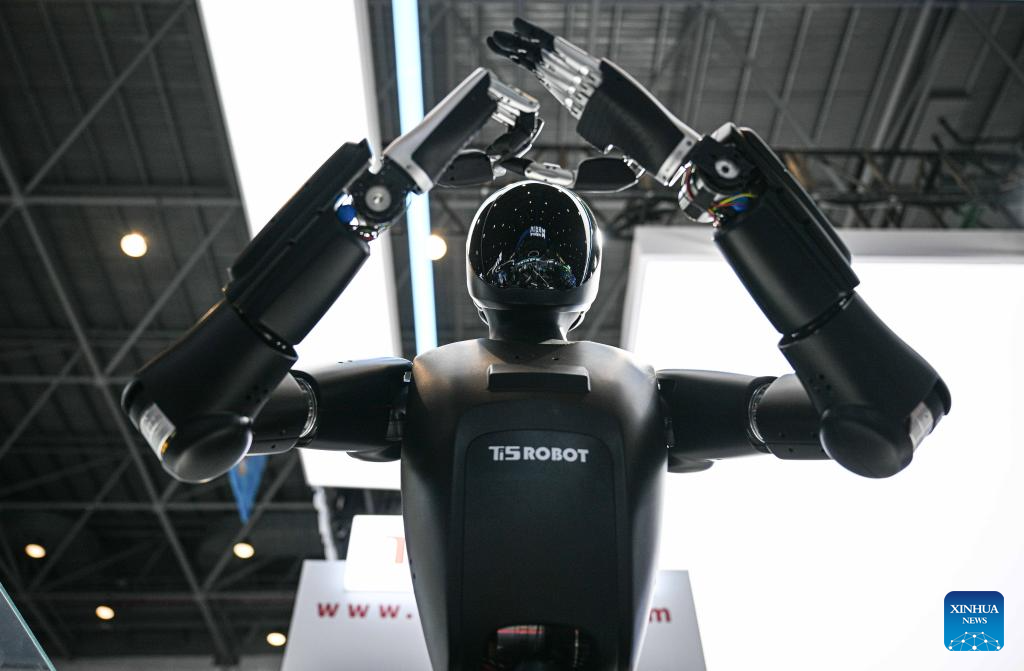 Un robot realiza un saludo tradicional de "puño y palma" en la V Exposición Internacional de Productos de Consumo de China (CICPE, por sus siglas en inglés), en Haikou, en la provincia de Hainan, en el sur de China, el 14 de abril de 2025. La exposición de este año destaca la tecnología futurista a través del debut de diversos robots innovadores. Al presentar funcionalidades impulsadas por Inteligencia Artificial y aplicaciones de mundo real, estos robots ofrecen un vistazo al futuro de la vida cotidiana. (Xinhua/Pu Xiaoxu)