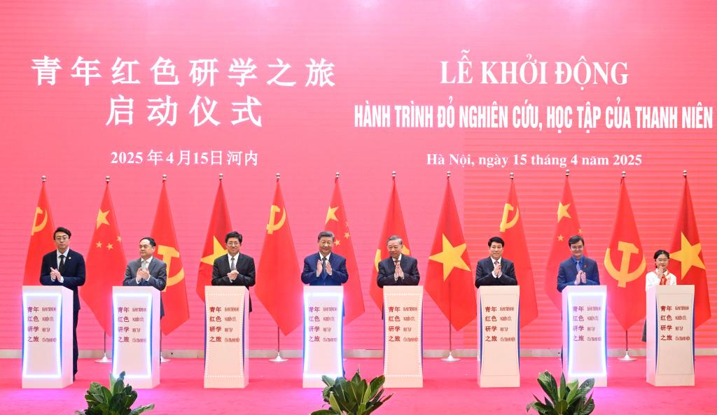 El presidente chino, Xi Jinping, también secretario general del Comité Central del Partido Comunista de China (PCCh), el secretario general del Comité Central del Partido Comunista de Vietnam, To Lam, y el presidente vietnamita, Luong Cuong, lanzan oficialmente el proyecto de "Viajes de Estudio Rojo" en el Centro Internacional de Convenciones, en Hanoi, capital de Vietnam, el 15 de abril de 2025. Los tres líderes lanzaron oficialmente el proyecto después de reunirse con representantes que asistieron a la Conferencia de Amistad entre los Pueblos de China y Vietnam, celebrada en Hanoi, capital vietnamita. (Xinhua/Shen Hong)
