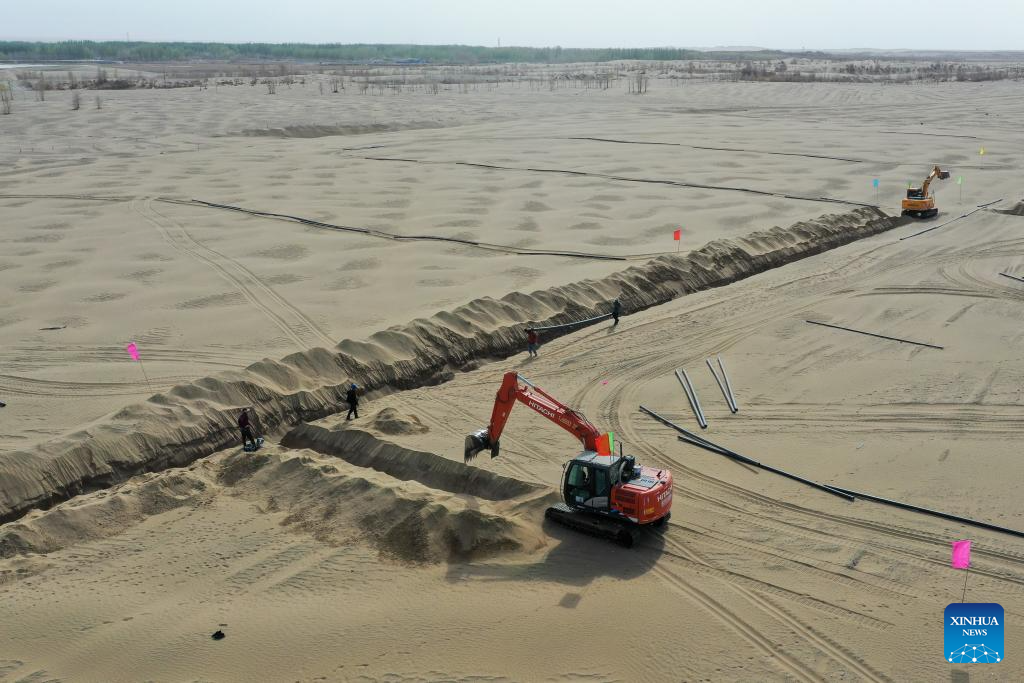 Vista aérea tomada con un dron el 8 de abril de 2025 de trabajadores empotrando tuberías de agua, en el distrito de Minfeng de la prefectura de Hotan, en la región autónoma uygur de Xinjiang, en el noroeste de China. El desierto de Taklimakan, en la región autónoma uygur de Xinjiang, en el noroeste de China, cubre 337.600 kilómetros cuadrados y su circunferencia mide 3.046 kilómetros, lo que lo convierte en el desierto más grande de China y el segundo desierto flotante más grande del mundo. El Taklimakan está ahora completamente rodeado por un cinturón verde, gracias a más de cuatro décadas de esfuerzos como parte del Programa de la Franja Forestal Protectora de los Tres Nortes, el programa de forestación más grande del mundo para enfrentar la desertificación. (Xinhua/Ding Lei)