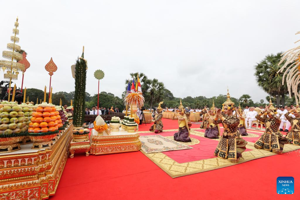 Imagen del 14 de abril de 2025 de artistas presentándose durante una ceremonia de oración, en la provincia de Siem Reap, Camboya. Camboya celebró el lunes una ceremonia de oración por la prosperidad del reino frente al famoso templo de Angkor Wat aquí. La elaborada ceremonia religiosa se llevó a cabo cuando Camboya inició la celebración de tres días de duración de su Año Nuevo Lunar, el Año de la Serpiente. (Xinhua/Sovannara)