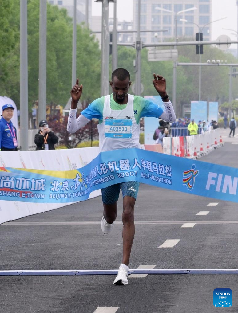 Elias Desta, de Etiopía, cruza la línea de meta durante la media maratón de Beijing E-Town y la media maratón de robots humanoides en el Area de Desarrollo Económico y Tecnológico de Beijing, en el sureste de Beijing, China, el 19 de abril de 2025. (Xinhua/Li He)