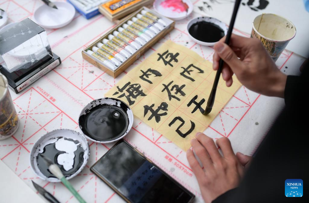Un hombre escribe caracteres chinos en el evento del Día Internacional del Idioma Chino 2025, en Almaty, Kazajistán, el 19 de abril de 2025. Un evento de celebración para conmemorar el Día Internacional del Idioma Chino 2025 se llevó a cabo aquí el sábado, ofreciendo una experiencia cultural inmersiva que combinó la caligrafía china, la pintura tradicional china, el Hanfu y la interpretación del Guzheng (cítara pulsada china). (Xinhua/Li Renzi)