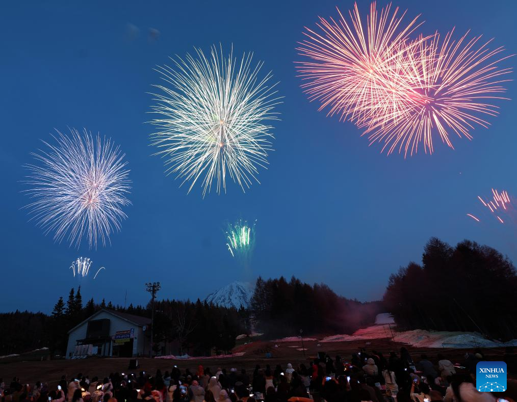 Personas observan fuegos artificiales durante un espectáculo de fuegos artificiales llevado a cabo al pie del Monte Fuji, en Yamanashi, Japón, el 19 de abril de 2025. (Xinhua/Jia Haocheng)