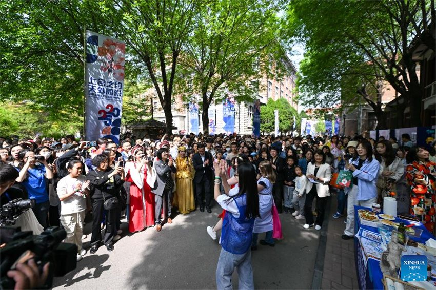 Unas estudiantes bailan durante el 8.º Festival Internacional de Cultura de la Universidad de Estudios Extranjeros de Tianjin, en la ciudad septentrional china de Tianjin, el 20 de abril de 2025. (Xinhua/Sun Fanyue.)