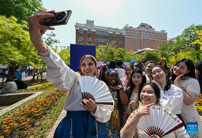 Unas estudiantes se toman selfis durante el 8.º Festival Internacional de Cultura de la Universidad de Estudios Extranjeros de Tianjin, en el norte de China, el 20 de abril de 2025. (Xinhua/Sun Fanyue.)