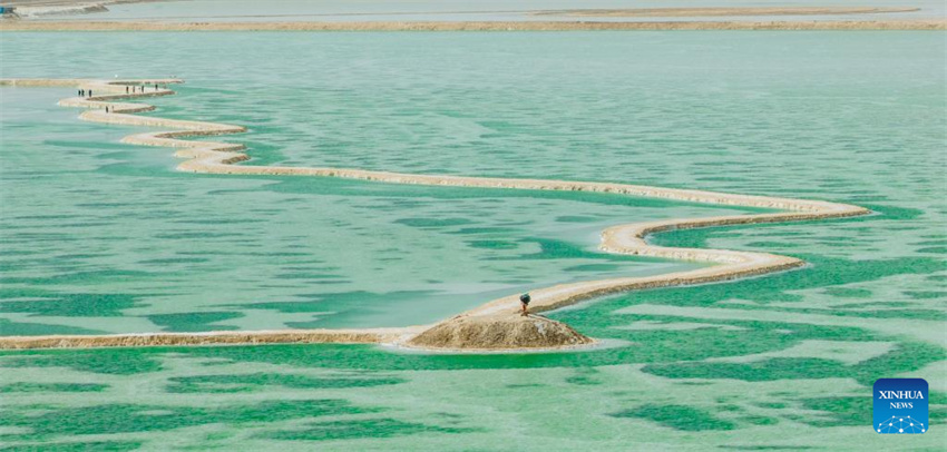 Una foto aérea tomada con un dron el 19 de abril de 2025 muestra el Lago de Jade en Mangya, prefectura autónoma de las etnias mongola y tibetana de Haixi, en la provincia noroccidental china de Qinghai. (Xinhua/Du Xiaowei.)