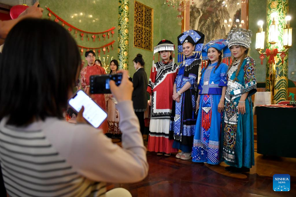Estudiantes con trajes étnicos chinos posan para unas fotos en el evento del Día Internacional del Idioma Chino 2025 en Moscú, Rusia, el 20 de abril de 2025. (Foto de Alexander Zemlianichenko Jr/Xinhua.)