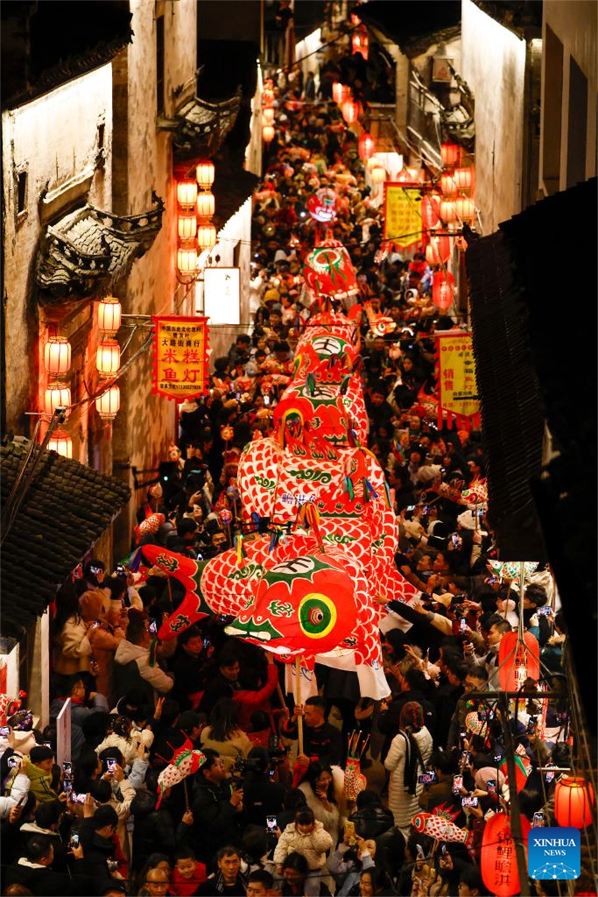 Los visitantes disfrutan de una representación de faroles con forma de pez en la aldea de Zhanqi del distrito de Shexian, ciudad de Huangshan, provincia oriental china de Anhui, el 31 de diciembre de 2024. (Fotografía de Shi Yalei/Xinhua.)