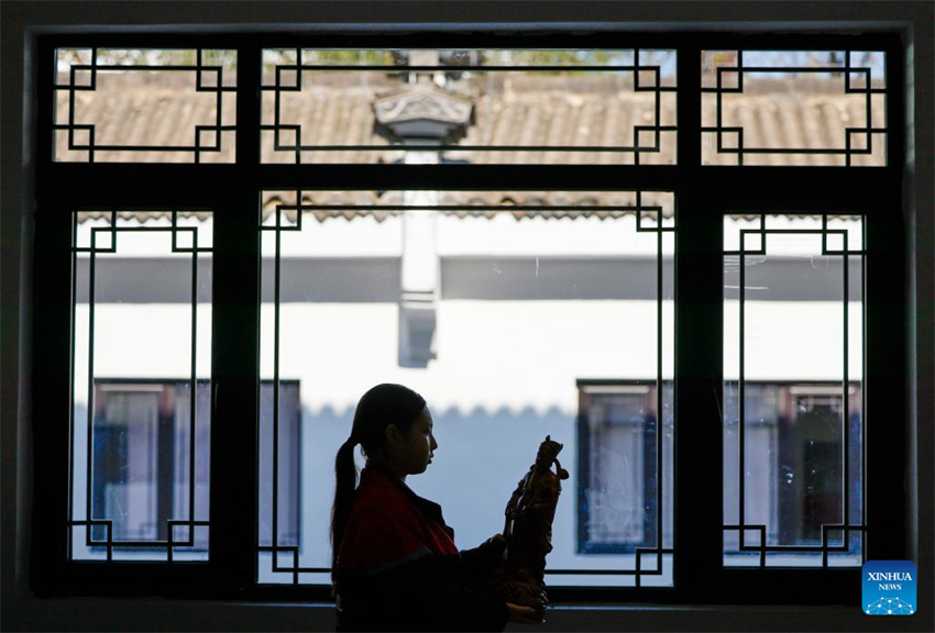 Una estudiante observa un trabajo de tallado en madera durante una clase de formación práctica en una escuela del distrito de Shexian de la ciudad de Huangshan, en la provincia oriental china de Anhui, el 27 de noviembre de 2024. (Foto de Shi Yalei/Xinhua.)
