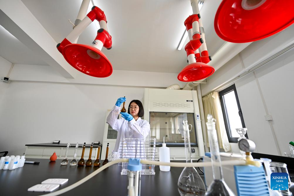 Zhang Fan, miembro del personal del Instituto de Investigación de las Grutas de Yungang, disuelve una muestra de la pared de las grutas en el instituto de Datong, en la provincia septentrional china de Shanxi, el 16 de abril de 2025. (Xinhua/Yang Chenguang.)