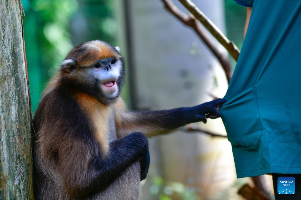 Un mono de nariz chata de Guizhou es visto en un centro de investigación de monos de nariz chata de Guizhou de la Reserva Natural Nacional del Monte Fanjing, en la provincia suroccidental china de Guizhou, el 15 de abril de 2025. (Xinhua/Yang Wenbin.)
