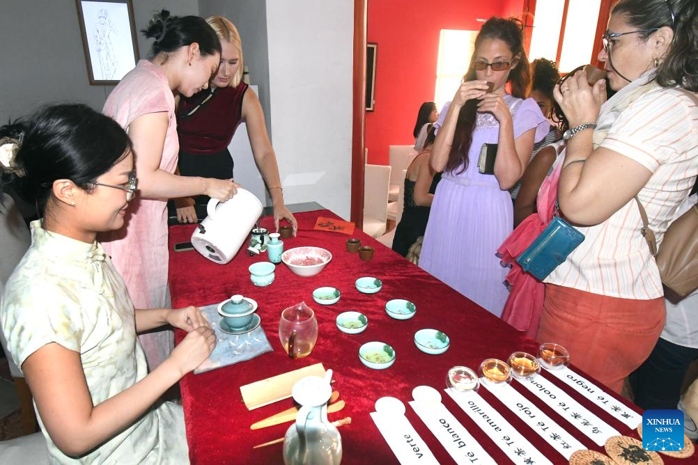 Personas degustan té después de ser realizada la tradicional ceremonia del té como parte de las actividades llevadas a cabo con motivo de la celebración del Día de la Lengua China en la sede del Instituto Confucio de La Habana, en La Habana, capital de Cuba, el 23 de abril de 2025. Jóvenes cubanos interesados en la lengua y cultura chinas participaron en diversas actividades organizadas por el Instituto Confucio de La Habana, con motivo de la reciente celebración del Día de la Lengua China. (Xinhua/Joaquín Hernández)