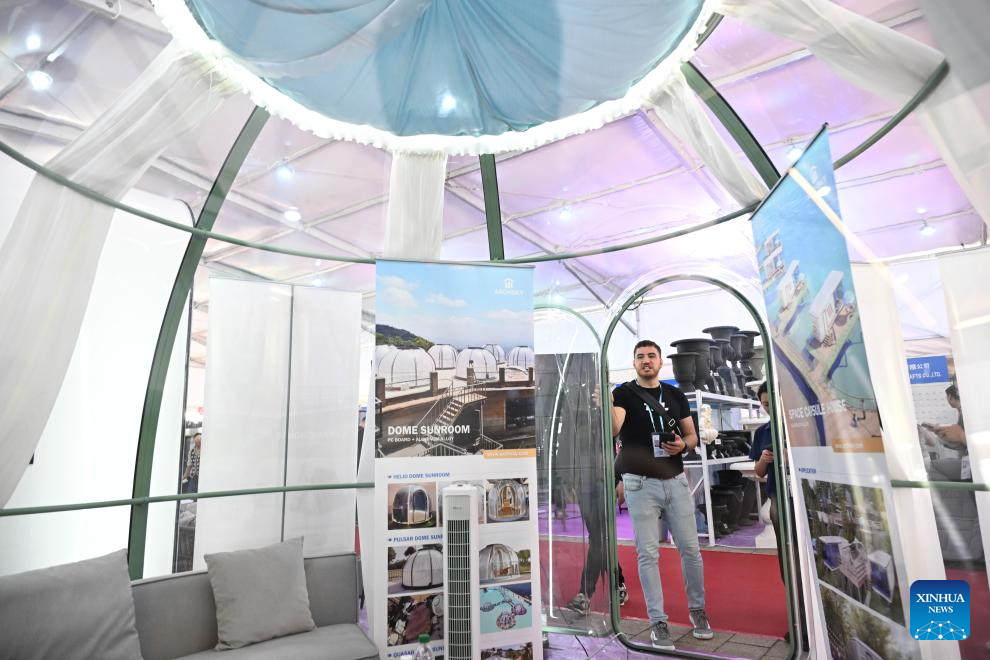 Un comprador extranjero revisa un producto de vivienda en un área que presenta productos integrados para vivienda en la 137ª edición de la Feria de Cantón, en Guangzhou, en la provincia de Guangdong, en el sur de China, el 23 de abril de 2025. La segunda fase de la 137ª edición de la Feria de Cantón con temática en muebles para el hogar de calidad se inauguró el miércoles. En el evento se instaló por primera vez un área con productos integrados para vivienda para mostrar casas móviles, casas modulares, casas ampliables y otros productos relacionados. (Xinhua/Deng Hua)