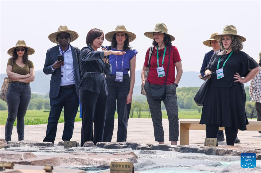 Invitados al Tercer Foro de Alto Nivel de la UNESCO para Museos visitan el Parque de las Ruinas Arqueológicas de la Ciudad de Liangzhu en Hangzhou, provincia oriental china de Zhejiang, el 23 de abril de 2025. (Xinhua/Jiang Han.)