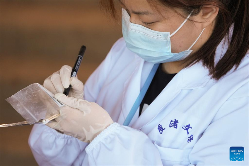 Una investigadora toma muestras de suelo de la muralla sur de las Ruinas Arqueológicas de la Ciudad de Liangzhu en Hangzhou, provincia oriental china de Zhejiang, el 18 de abril de 2025. (Xinhua/Weng Xinyang.)
