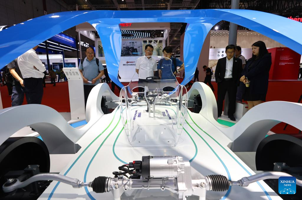 Personas observan un módulo del sistema de dirección por cable en la XXI Exposición Internacional de la Industria Automotriz de Shanghai, en Shanghai, en el este de China, el 25 de abril de 2025. Con el tema "Abrazando la Innovación, Empoderando el Futuro", la exposición, también conocida como Auto Shanghai 2025, comenzó aquí el miércoles, atrayendo a casi 1.000 empresas destacadas de 26 países y regiones. Además del debut de nuevos modelos, los fabricantes de automóviles también aprovecharon el escenario con sus últimas tecnologías para vehículos inteligentes, como la conducción inteligente, sistemas de inteligencia artificial (IA) y cabinas inteligentes. (Xinhua/Fang Zhe)