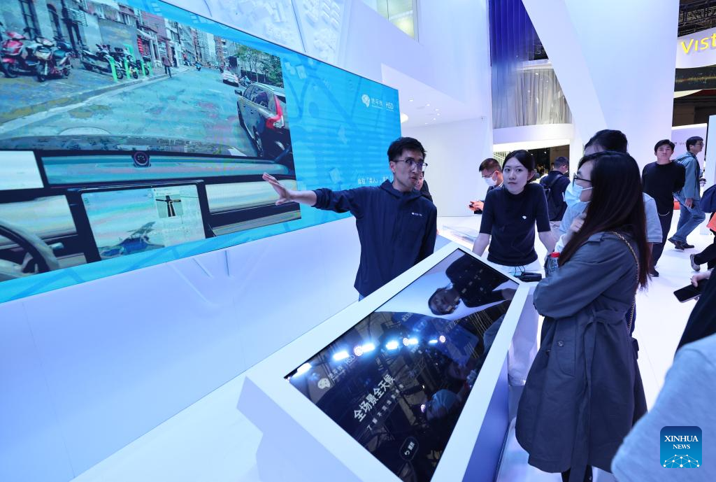 Un trabajador (i) de Horizon Robotics muestra un sistema de asistencia de conducción en la XXI Exposición Internacional de la Industria Automotriz de Shanghai, en Shanghai, en el este de China, el 25 de abril de 2025. Con el tema "Abrazando la Innovación, Empoderando el Futuro", la exposición, también conocida como Auto Shanghai 2025, comenzó aquí el miércoles, atrayendo a casi 1.000 empresas destacadas de 26 países y regiones. Además del debut de nuevos modelos, los fabricantes de automóviles también aprovecharon el escenario con sus últimas tecnologías para vehículos inteligentes, como la conducción inteligente, sistemas de inteligencia artificial (IA) y cabinas inteligentes. (Xinhua/Fang Zhe)