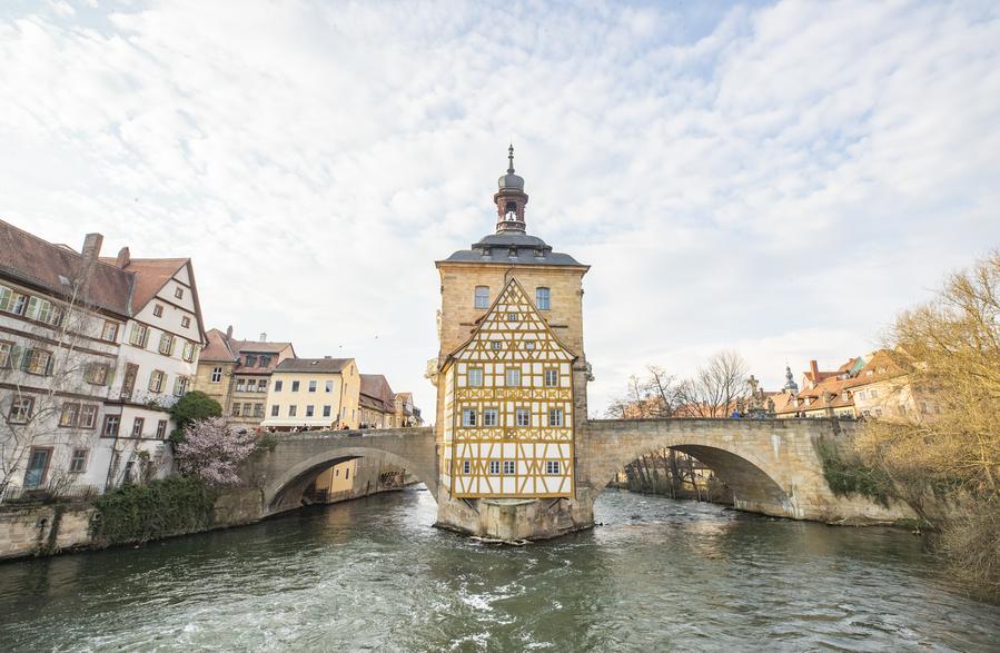 Esta foto tomada el 23 de marzo de 2025 muestra un edificio emblemático de la antigua ciudad de Bamberg, el antiguo ayuntamiento construido sobre el río Regnitz, en el estado de Baviera, Alemania. (Xinhua/Zhang Fan.)