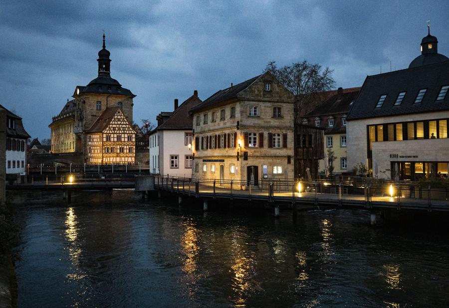 Esta foto tomada el 24 de marzo de 2025 muestra la vista nocturna de la antigua ciudad de Bamberg, en el estado de Baviera, Alemania. (Xinhua/Zhang Fan.)