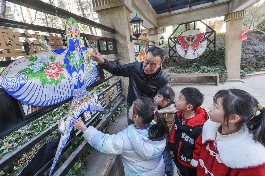 Niños aprenden sobre la estructura y las características de las cometas tradicionales en una comunidad de la ciudad de Huzhou, provincia oriental china de Zhejiang, el 19 de marzo de 2025. (Xinhua/Xu Yu.)