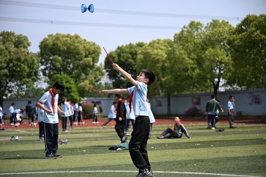 Alumnos practican el juego del diábolo en el patio de recreo de una escuela primaria del distrito de Xiuzhou, en Jiaxing, provincia oriental china de Zhejiang, el 23 de abril de 2025. (Xinhua/Liu Mingxiang.)