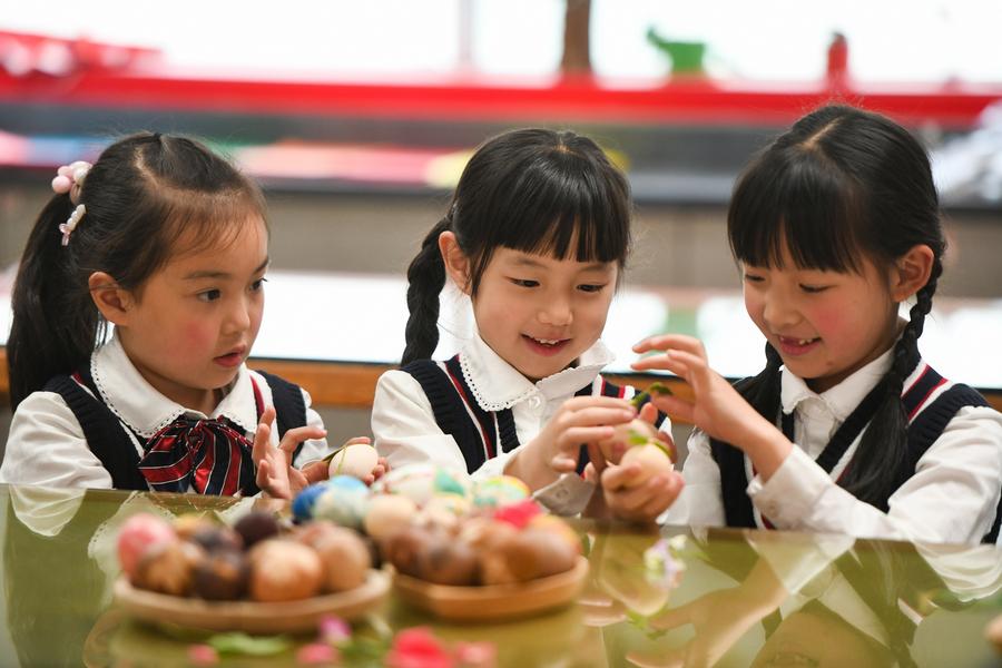 Estudiantes decoran huevos con flores y hierba para el Festival Qingming, o Día de Barrido Tumbas, en una escuela primaria de la ciudad de Jinhua, provincia oriental china de Zhejiang, el 3 de abril de 2025. (Foto de Shi Kuanbing/Xinhua.)