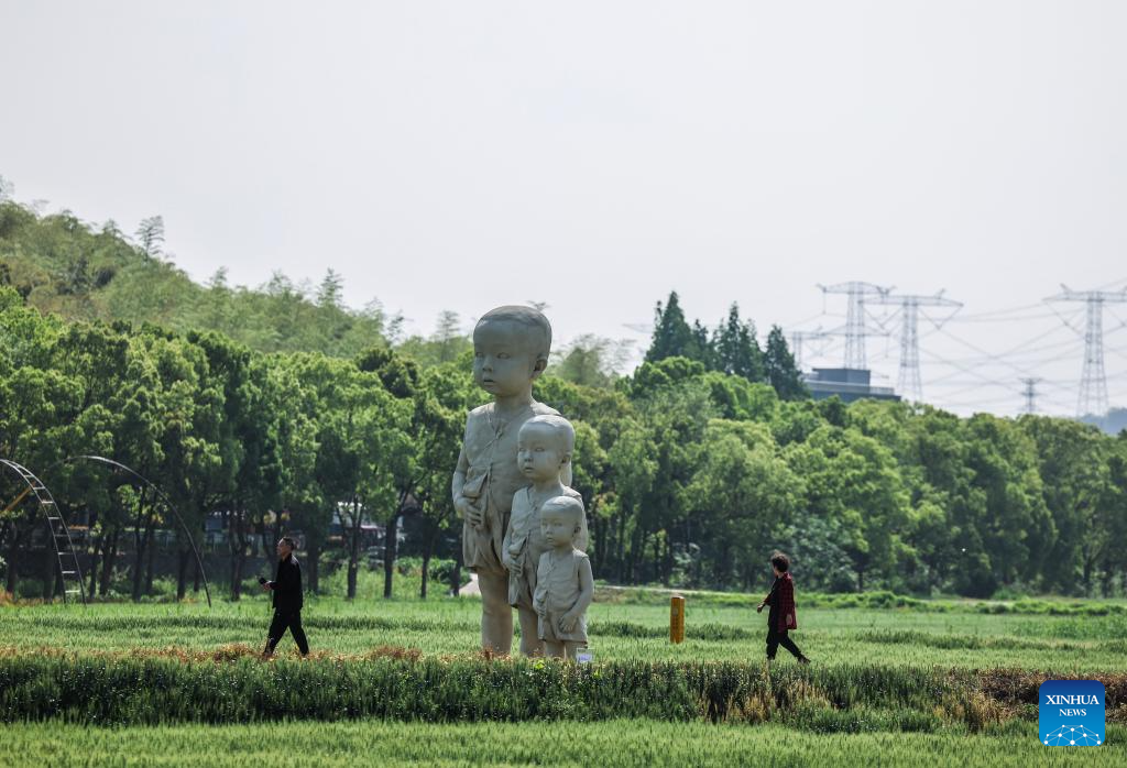 Aldeanos caminan junto a una obra de arte exhibida en los campos, en el poblado de Donglin, en la ciudad de Huzhou de la provincia de Zhejiang, en el este de China, el 25 de abril de 2025. Un evento de arte terrestre comenzó el viernes en los campos de trigo del poblado de Donglin. Profesores y estudiantes de diversas academias de bellas artes chinas formaron el equipo creativo central, produciendo 42 piezas de arte terrestre. Tomando la vasta tierra como lienzo y los elementos naturales como entorno, los artistas integraron hábilmente diversas formas de arte, como las instalaciones de arte y el paisajismo en los campos y las aldeas, permitiendo a los turistas y a la población local disfrutar de las obras de arte en el campo. (Xinhua/Xu Yu)