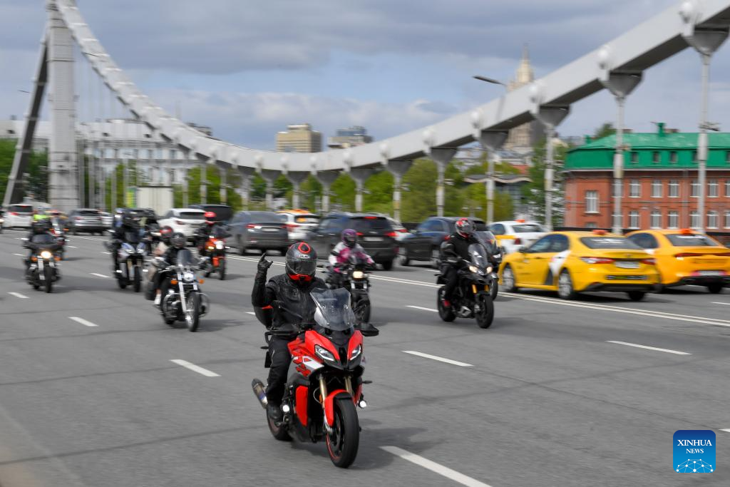 Motociclistas participan en un desfile de motocicletas, en Moscú, Rusia, el 26 de abril de 2025. El desfile marcó la apertura oficial de la temporada de motociclismo en Moscú. (Xinhua/Alexander Zemlianichenko Jr)