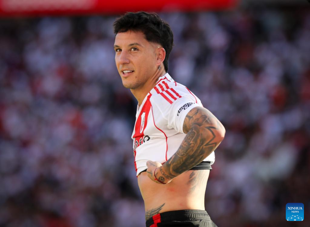 El jugador Sebastián Driussi, de River Plate, festeja su anotación durante el partido correspondiente a la Jornada 15 del Torneo Apertura de la Liga Profesional celebrado en el Estadio Antonio Vespucio Liberti, en la ciudad de Buenos Aires, capital de Argentina, el 27 de abril de 2025. (Xinhua/Martín Zabala)