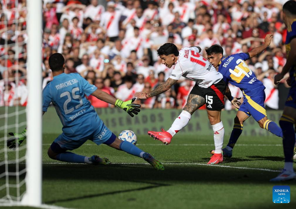 El jugador Sebastián Driussi (c), de River Plate, disputa el balón con el guardameta Agustín Marchesín (i), de Boca Juniors, durante el partido correspondiente a la Jornada 15 del Torneo Apertura de la Liga Profesional celebrado en el Estadio Antonio Vespucio Liberti, en la ciudad de Buenos Aires, capital de Argentina, el 27 de abril de 2025. (Xinhua/Martín Zabala)