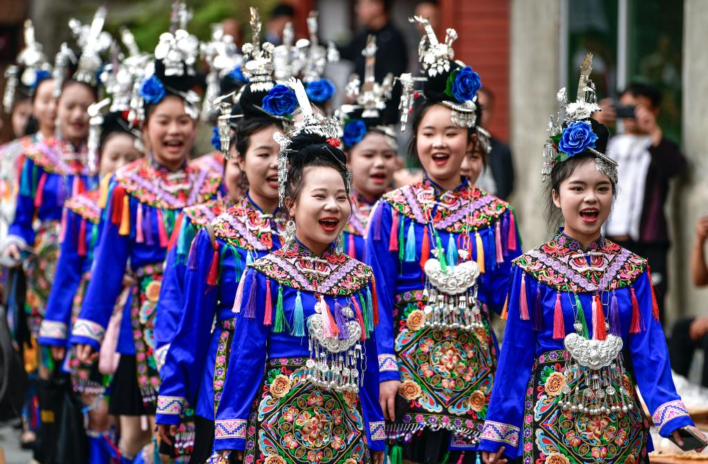 Niñas portando trajes étnicos participan en un evento cultural, en el distrito de Congjiang, en la provincia de Guizhou, en el suroeste de China, el 26 de abril de 2025. Una variedad de eventos culturales se llevaron a cabo aquí para mostrar la agricultura tradicional y los coloridos trajes étnicos locales. (Xinhua/Yang Wenbin)