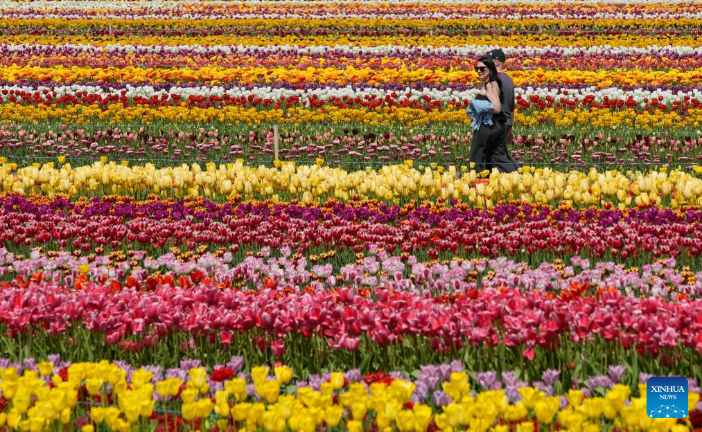 Imagen del 25 de abril de 2025 de personas caminando entre hileras de tulipanes, en Abbotsford, Columbia Británica, Canadá. Un festival del tulipán, con más de 100 variedades de tulipanes, se celebra en Abbotsford hasta el 11 de mayo. (Xinhua/Liang Sen)