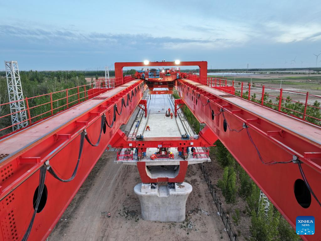 An aerial drone photo taken on April 27, 2025 shows workers erecting a box girder at the construction site of a mega bridge in the Hebei section of the Xiong'an-Shangqiu high-speed railway in north China's Hebei Province. Girder erection work in the Hebei section of Xiong'an-Shangqiu high-speed railway was fully completed on Sunday as the last box girder was erected on a mega bridge. The 552-kilometer-long railway will connect Xiong'an in north China's Hebei Province and Shangqiu in central China's Henan Province with a designed speed of 350 kilometers per hour. (Xinhua/Mu Yu)
